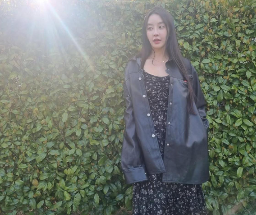 드레스의 길이 또한 인상적이다. 무릎 아래로 흘러내리는 롱 드레스는 봄바람을 품은 듯 가볍고 유연하다. 단정한 라인에 작은 꽃들이 흐드러지듯 흩어져 있어, 어떤 포즈에서도 패턴이 흐트러지지 않는다. 그 위에 걸친 셔츠가 살짝 열리며, 걸을 때마다 드러나는 블랙 앤 플라워의 조화가 눈부시다.