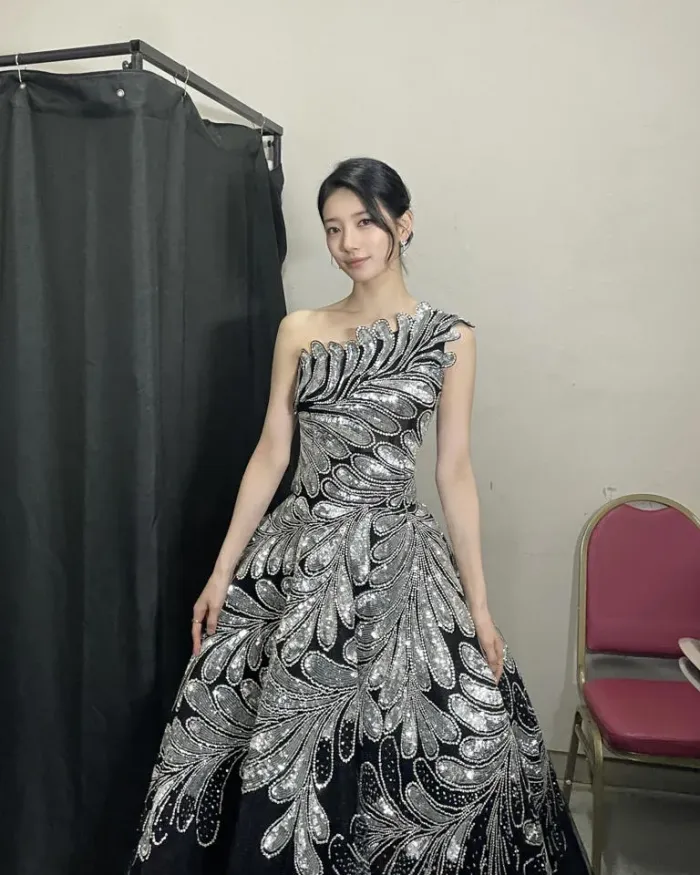 본 시상식 무대에서 착용한 원숄더 블랙 드레스로 화려한 깃털 디테일의 실버 패턴이 돋보이는 디자인이었다. 비대칭 컷으로 어깨 라인을 우아하게 드러내는 동시에 전체적으로 유려하게 퍼지는 실루엣이 수지의 고급스러운 분위기와 어우러져 눈부신 자태를 완성했다.