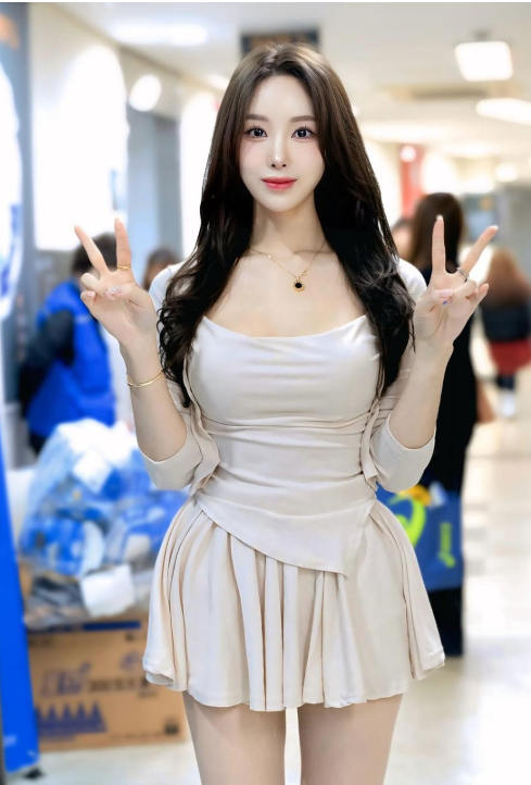 아이보리빛 드레스를 입고 두 손 가득 브이 사인을 그려낸 이리안의 모습은 무대 위가 아닌 복도 한가운데서도 단연 돋보였다. 은은하게 빛나는 새틴 질감의 미니 드레스는 그녀의 탄탄한 피지컬을 살려주면서도 자연스럽게 흐르는 주름이 우아함을 더했다.