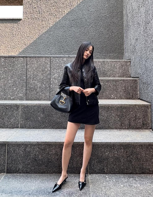 이 룩은 지금 계절에 특히 잘 어울린다. 초봄의 날카로운 바람과 따뜻한 햇살이 공존하는 시기, 그 복잡한 온도를 블랙 레더 재킷 하나로 단순화시킬 수 있기 때문이다. 짧은 하의로 시즌감을 살리고, 액세서리로 마무리한 그녀의 선택은 간결하면서도 정확하다.